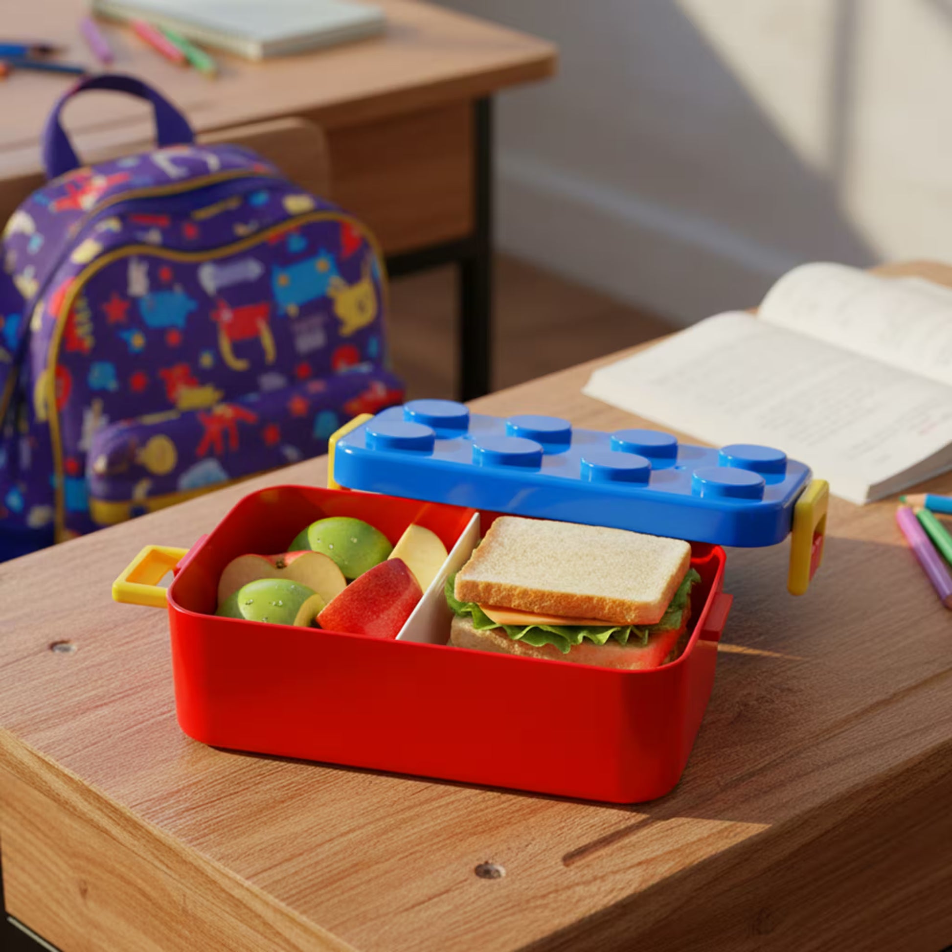 Haz que la hora del almuerzo sea más divertida y organizada con esta lonchera tipo Lego. ¡Perfecta para construir buenos hábitos alimenticios con estilo!