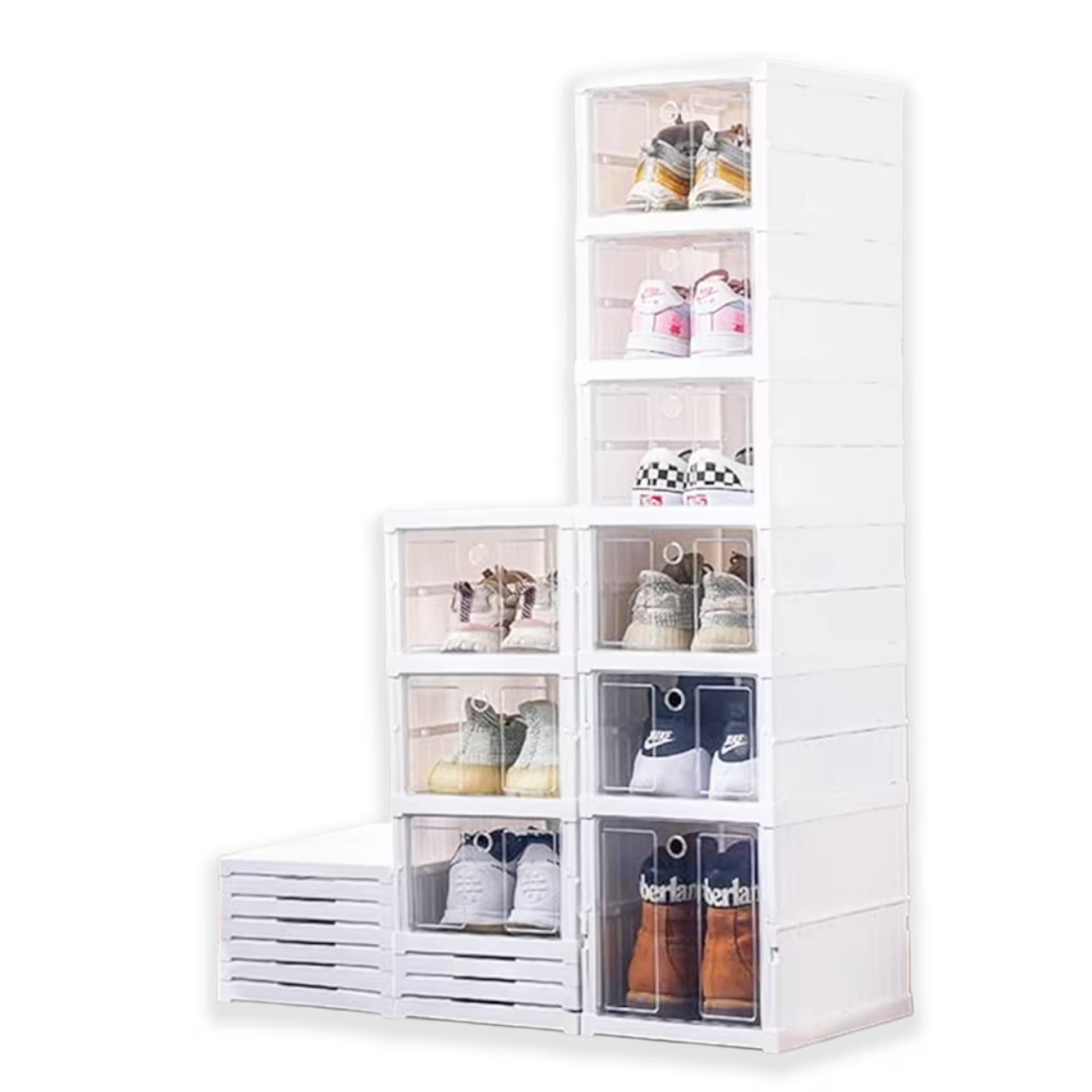 - Diseño Minimalista y Apilable: Su estructura modular te permite apilar las cajas una sobre otra, creando una torre vertical que se adapta a cualquier rincón de tu hogar o armario. El diseño blanco puro con puertas transparentes aporta un toque de sofisticación y orden.